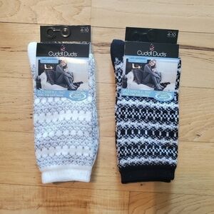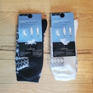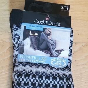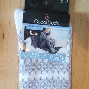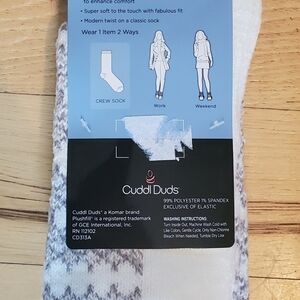 CuddlDuds Leg Layering Crew Plushfill 360 Socks. Fairisle Geo. Live in layers, ultimate in comfort & function, modern twist on a classic sock. Size 4-10 shoe size, fits sock size 4-10. Colors of ivory white/gray twist & black/gray white twist. Crew silhouette. Made with plush fill yarn, polyester and spandex, super soft material. 2 pairs/sets available! Brand new with tags in plastic. Cuddle Duds