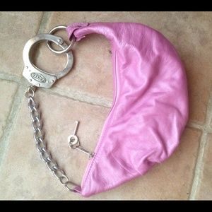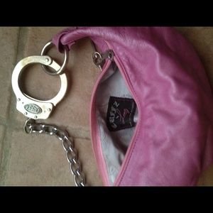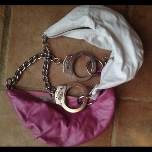 "Finally, a handbag designed specifically to meet the needs of the party girl in all of us!! It's simple: the key is on your zipper, so just cuff the bag to your wrist (an instant eye-catching, ice-breaking accessory) and let the bag sit on the bar. That way, there's no chance you'll misplace your valuables even when you're a few cocktails into your evening."...White Leather and Purple Ice Available. Seen all over Hollywood . Like New without tags.