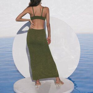 The Serita is a cutout woven knit maxi dress. Thoughtful cutouts shape your figure, highlighting the small of your waist. A bra silhouette with a bare all open back. For larger busts, we recommend sizing up. This style tends to run small.