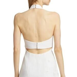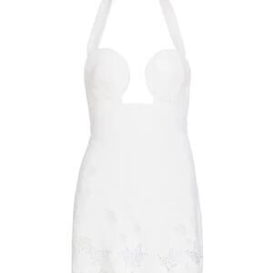 Crafted of linen, the Kailani minidress from Cult Gaia highlights a plunging halterneck and intricate eyelet trim.