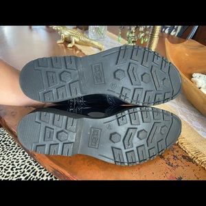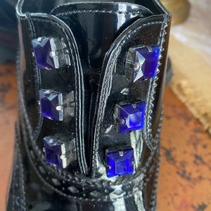 Very cool and unique design! Purchased in Spain only wore these on a trip once - like new condition. Please note one missing gem as shown on the picture. All leather black and dark blue color rubber sole