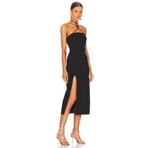 The Casila is a statement piece featuring a marbled acrylic spiral ornament inspired by Persian crafts that connects the bust below and creates a halter neckline that ties to secure behind the neck. The stretchy fabric is expertly fitted and a high slit on the right allows for stunning movement with a hint of allure. The upper body is double lined for structure and features a side zipper for easy wear.