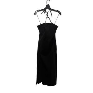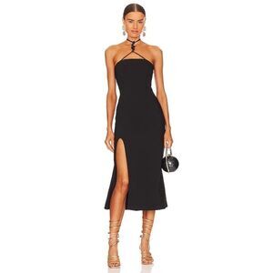 The Casila is a statement piece featuring a marbled acrylic spiral ornament inspired by Persian crafts that connects the bust below and creates a halter neckline that ties to secure behind the neck. The stretchy fabric is expertly fitted and a high slit on the right allows for stunning movement with a hint of allure. The upper body is double lined for structure and features a side zipper for easy wear.