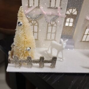 Cupcakes and Cashmere Glittered Holiday House featuring bottle brush trees, a deer figurine, picket fence, gingerbread, snow topped roof, tinsel stems, bows and more glitter!