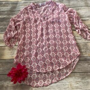 Cupid’s Diary. Size small. Excellent-new without tags. Sheer shirt with Aztec design. V neck. 26”