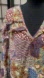 Chic fabric with intricate white lace. Bold brown design enhances style. LONG BALLOON SLEEVES WITH ELASTIC CUFF, VNECK, RUFFLED SLEEVE CAP, PRE OWNED IN EXCELLENT CONDITION: