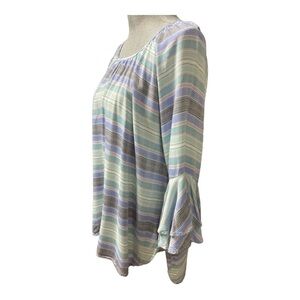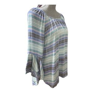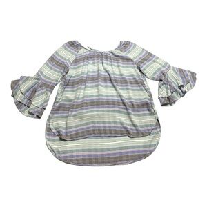 A2424. Hi-Low Hemline Blouse with Ruffled Tired Bell 3/4 Sleeves, Blue, Gray, & Purple stripes on White Pullover, back tie string at neck. Nice quality Rayon fabric. New with tags.