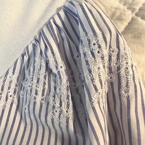 Pullover style with scoop neck. Short blouson sleeves with 3 rows of eyelet embroidery and elasticized sleeve base before a 2” ruffle. Soft viscose/spandex bodice with a high low hem. Length is 25” in the front and 27” in the back.