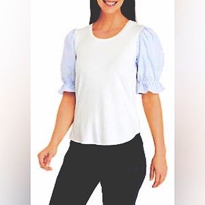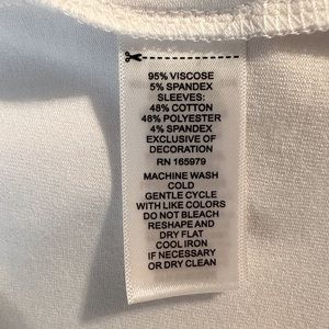 The bodice is 95% viscose, 5% spandex. The sleeves are 48% cotton, 48% polyester, 4% spandex exclusive of decoration. Cold wash, gentle cycle, dry flat. 🔹NWT🔹