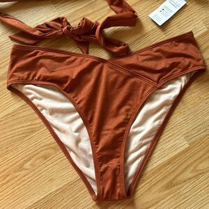 Two Piece Swimsuit Features O Ring and Wrapped Back Tie on the Top. V Rise Bottom with Shimmer Fabric Can Catch Everyone's on the Beach. Light shimmer. 77% Nylon, 13% Spandex,10% Metallic. Size XL. New, with tags.