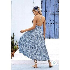 Is the most flattering dress because it works for so many body types. This dress has an adjustable tie that gathers in the front and ties around the neck. This maxi dress can be effortlessly worn to the beach or dressed with heels on a night on the town. white, Navy and Blue paisley and floral print.