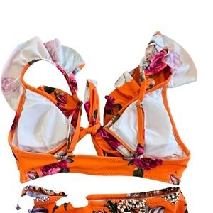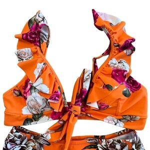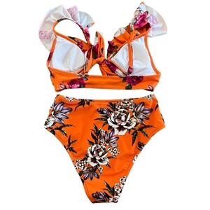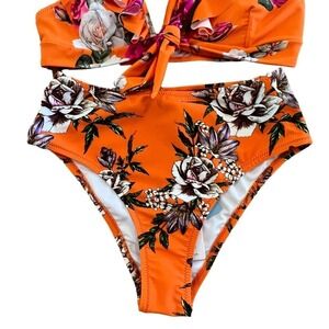 CUPSHE FLORAL RUFFLE HIGH RISE 2 PIECE BIKINI SET NWT ORANGE WOMEN'S SIZE XS