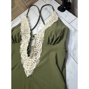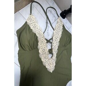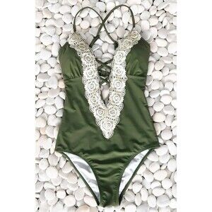 CUPSHE Green Cream Crocheted One-Piece Swimsuit Sexy V-Neck Sz L Coastal Beach