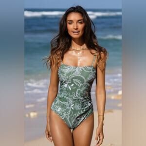 CUPSHE NWT Green & White Floral Print Shirred Cutout One Piece Swim Suit Medium