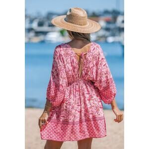The product is a stylish and trendy Cupshe NWT mini dress in a paisley floral pattern, perfect for a casual or dressed-up look. The dress features a tie closure at the back, a flattering silhouette in a women's size small, and a vibrant pink color that adds a pop of femininity. With a flower theme and short length, this dress is a versatile and chic addition to any wardrobe, suitable for various occasions and settings.