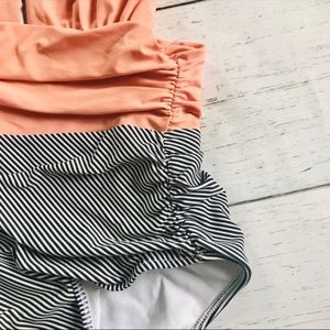 This swimsuit is in great condition and has been lightly worn. Ties at the top and cinching along both sides. DOES NOT HAVE PADDING! Full coverage bottom. Slight threading coming loose on right inside hip.
