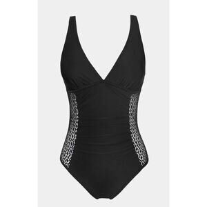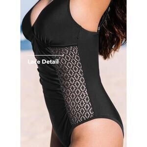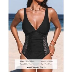 CUPSHE Ruched Lace Plunge V-Neck Black One Piece Swimsuit NWT SIZE XS