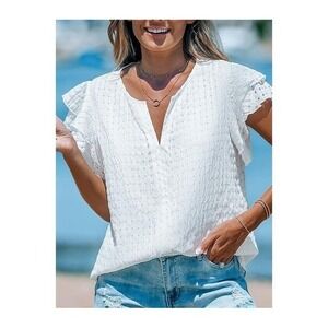 CUPSHE Tops for Women V Neck Eyelet Shirt Casual Hollow Out Ruffle T-Shirt M Size M Color White NWT P415 F5-07 See All measurements in pictures The V neck eyelet blouse showcases your slender and elegant neckline, while the ruffle sleeves add a touch of playfulness. Designed in basic solid colors, our women's summer hollow out t-shirts are simple yet stylish. Pair them with jeans, shorts, or skirts to create different fashion looks, allowing you to exude charm in various occasions. Our women's summer eyelet tops are a must-have for the season, with a simple and elegant design suitable for various occasions. such as daily wear, work, parties, school, shopping, dates, weddings,holidays, vacations, and more. Our eyelet short sleeve tops are loose-fitting and comfortable, Made of lightweight and breathable fabric, they keep you cool and comfortable during hot weather. They are suitable for summer, spring, and fall. Machine or Hand Wash with Cold Water/Hang or Line Dry/No Bleach/No