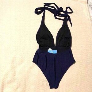 navy swimsuit, deep v-neck swimsuit, halter swimsuit, one-piece swimsuit, women's swimwear, beachwear, adjustable straps, wrap swimsuit, comfortable swimwear, stylish swimsuit, summer swimwear, full coverage, crisscross back swimsuit