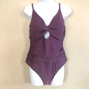 Elegant one-piece swimsuit in plum and lavender. Features a chic design. Ideal for the beach or poolside lounging.