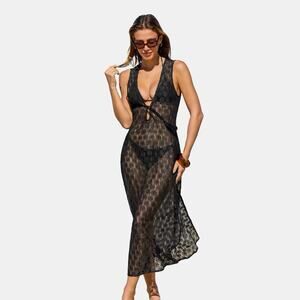 CUPSHE Women’s Black Knit Sheer Daisy Midi Cover-Up Dress with Front Tie SZ S