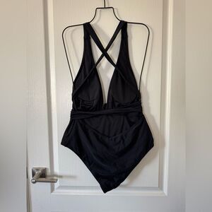 Chic black one-piece swimsuit with halter neck and wrap tie. Black Sexy Deep V Neck One Piece Swimsuit with Self-tie Straps at Waist and Criss Cross at Back. Removable bra pads. Ideal for beach outings.