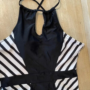Cupshe one piece swimsuit with sexy deep V neck with cross-cross straps in back. Cute black and white design.