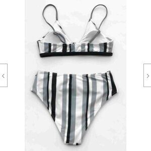 CUPSHE vertical striped high waist bikini top and bottom in gray, black and white. Bikini top with removable pads in cups. High waisted bottom is shirred at sides.