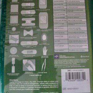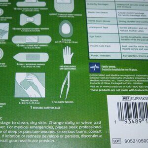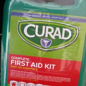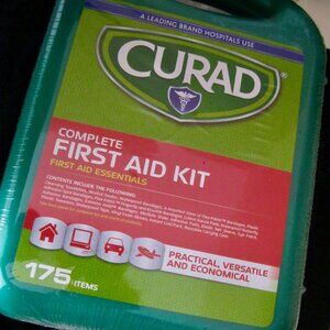 CURAD COMPLETE FIRST AID KIT OFFERING 175 FIRST AID ESSENTIALS... This very important first aid kit should be in your home or car or on camping trips. It offers everything you could possibly need perhaps while getting an injured person to an Emergency Room. As the endorsement says "Practical, Versatile and Economical. Here's a "short list" of the items included, Alcohol swabs, cleansing towelettes, gauze, waterproof bandages and more! The photo showing the back of the reusable carrying case (with handle) shows a list of all the ingredients included. Another good idea for this is to send it to your college bound kids. It will ship to the lucky buyer in the reusable carrying case (green) and in a shipping container. Any questions, please feel free to ask.