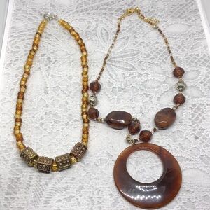 Handmade caramel color beaded toggle clasp necklace and amber color circular pendant necklace.