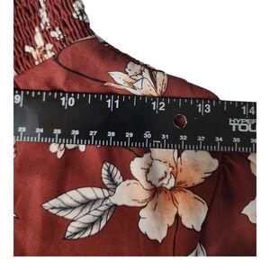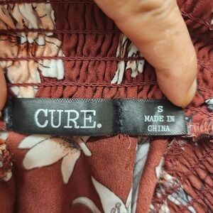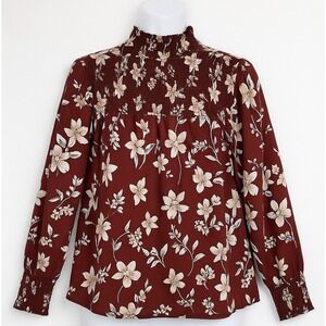 Elevate your everyday style with this CURE blouse featuring a smocked high/mock neck, long sleeves with smocked cuffs, and an allover floral print on a rich burgundy base. Lightweight 100% polyester—perfect for work, brunch or date night.Note: Pre-owned in good condition; only one back-neck button is missing. See photos carefully for condition + measurements, or send a message for more details.