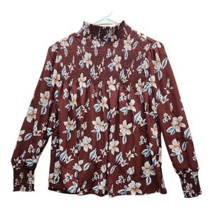 CURE Women's Floral Smocked High Neck Long Sleeve Blouse Size S Burgundy Vintage