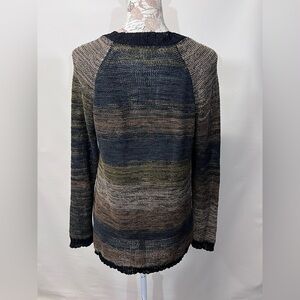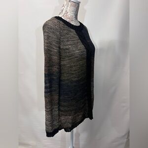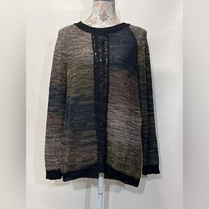 Black and taupe blended open knit sweater from CURIO NY, size L. Top has crew neckline and crochet front stripe accent.