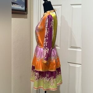 CURRENT AIR FLORAL BLOCKMINI DRESS, SPRING MULTI, SURPLICE STYLE BODICE, RUFFLE TRIM, THREE QUARTER SLEEVES ELASTIC WAIST, TIERED SKIRT, PTP 19.5” LENGTH 35” SIZE M (6-8) NEW WITH TAG