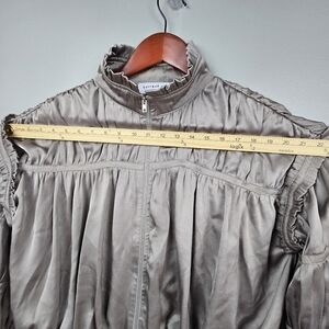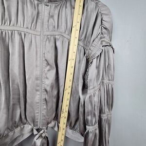 Elevate your wardrobe with this Current Air Anthropology gray satin blouse jacket. The long puff sleeves and pleated accents add a touch of designer flair to this cropped top, while the full zipper ensures a secure fit. The crew neckline and bow detail complete the look. Crafted from high-quality polyester, this blouse is suitable for all seasons and perfect for women who appreciate fashion-forward style. The solid pattern and gray color make it easy to pair with any outfit. This Current Air blouse is a must-have for any wardrobe.