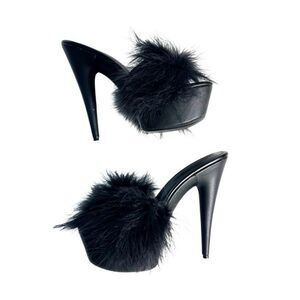 CURRENT MOOD Sinful Money Hunny Black Maribou Platform Feather Slide Heels Size 38 US 7.5 Pleaser Peep Toe SEXY