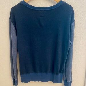 CURRENT/ELLIOTT The Stadium relaxed sweatshirt. Settle into cozy comfort! Boat neckline. Long sleeves with dropped shoulders and banded cuffs and hem. Size 0 (women's size 2-4) Color: Heather Blue/ Navy. 54% cotton 37% polyester 9% rayon. Condition: Excellent; gently worn; well maintained; no stains, marks, holes, or rips (except for those originally on distressed fabric to create look).