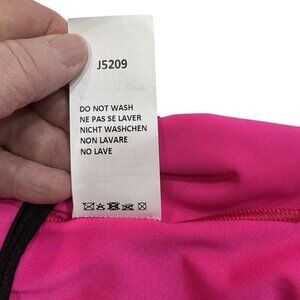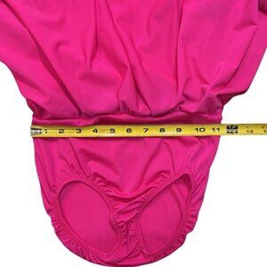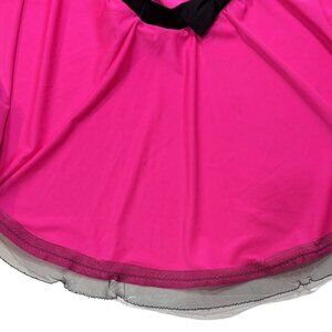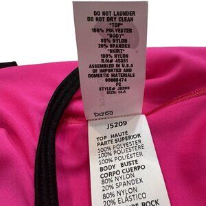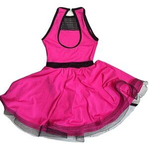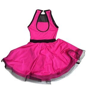 CURTAIN CALL ~ Girl's size CLA dance dress / costume / leotard in hot pink and black accents. Sleeveless. Cut-out back. Front has black openwork neckline. Attached briefs and crinolined skirt. Style #J5209.