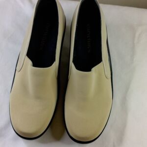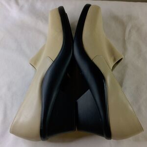 Golden beige slip on leather pumps. Top is soft fabric and side to heel is leather.