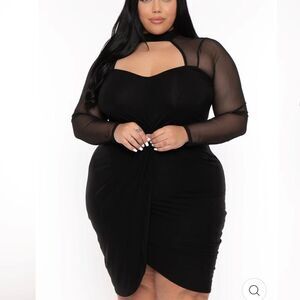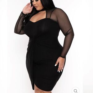 This plus size, stretch knit dress features a straight neckline, long mesh sleeves, front twist knot giving it an asymmetric hem and a bodycon silhouette.