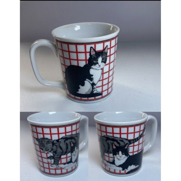 Charming Curzon ceramic coffee mug featuring black and white tuxedo cats against a red grid background. Durable glossy finish with comfortable handle. A delightful vintage collectible for cat lovers and kitchen decor enthusiasts.