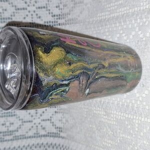 CUSTOM MADE RESIN TUMBLER "Hot Mess Express". 14oz. hot Tumbler. Hot Pink writing. Tie Dye design done in metallic colors pink, gold, black, and torqoiuse. In New condition.