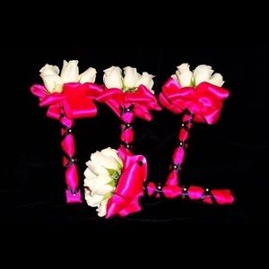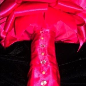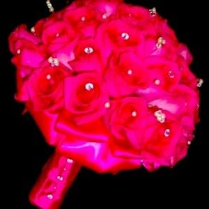 Custom ordered wedding flowers filled with hot pink roses and crystal embellishments.
