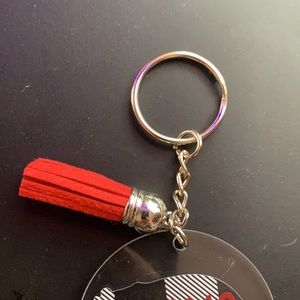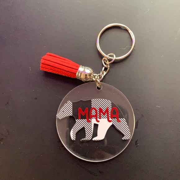 Cute acrylic keychain with a red tassel and momma bear on the front. This is a handmade item and one of a kind. Different colors can be requested.