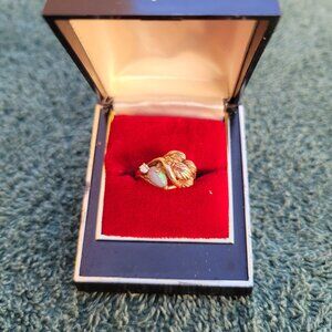 This is a beautiful Custom-Made 14k Yellow Gold Ring. It has a Tear Drop Opal and a 3 point Diamond among the Gold Leaves. This beautiful Ring would make a wonderful gift for that special person in your life or for yourself.