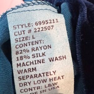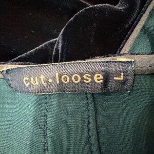A beautfiul blue velvet asymmetric tunic/ dress from CUT LOOSE, size large ladies. Measures approximately 32.5" L from shoulder to longest edge and 21.5" pit to pit. Has pockets. Tiny flaw as shown in last photo.