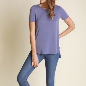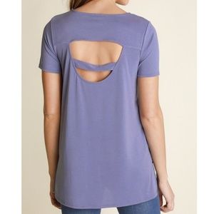 Price firm. Beautiful purple cut out back top with hi low hemline. Back strap covers bra line! Fabric is amazing! Super Soft and stretchy, I like this style it's not skin tight a bit more lose on midsection. Fabric is 72% Modal and 23% Polyester. True to size.