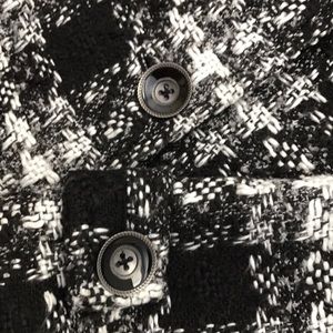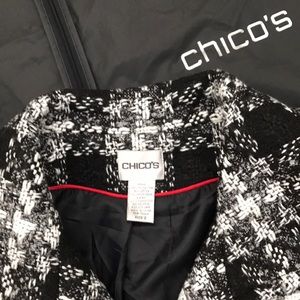 Checkered jacket with lining from Chico's. Three front buttons plus buttons on sleeves. Chico's sizing in a 2. Excellent condition, only worn a couple times. Dry Clean Only. Comes with Chico's Garment Bag.