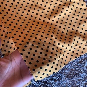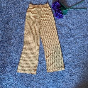 These are a yellow with black poke-a-dot type pants with pockets the back and splits on both sides or the ends of the pants