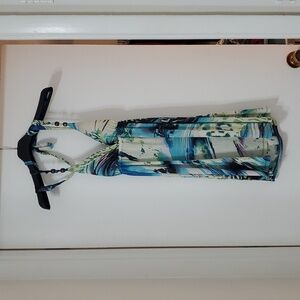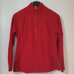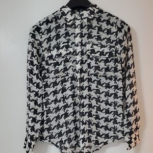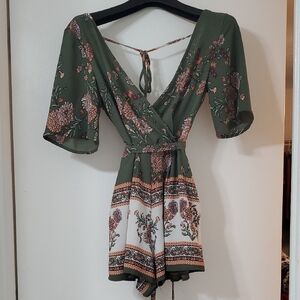 Beautiful camel color with kind of a rounded v-neckline that ties. So cute, love this top and don't want to part with it but it's just too small for me.